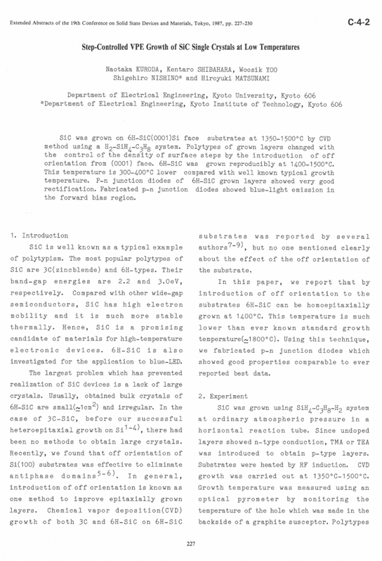 N. Kuroda, K. Shibahara, W. Yoo, S. Nishino, H. Matsunami,“Step-Controlled VPE Growth of SiC Single Crystals at Low Temperatures,”