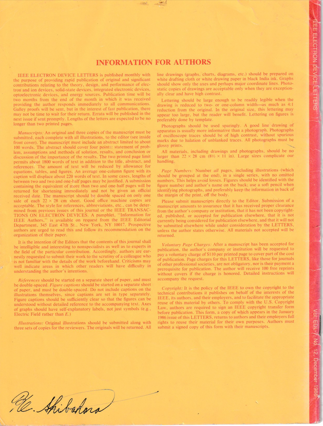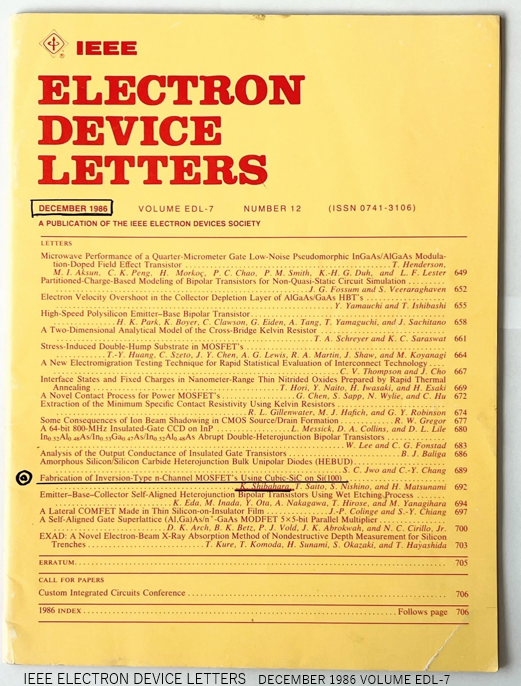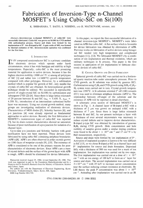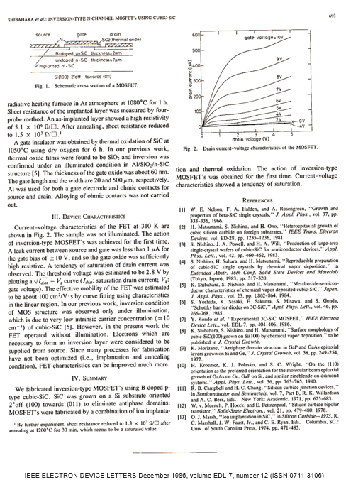 芝原健太郎が作成したSiCパワーデバイス(反転型SiC-MOSFET)は世界初の快挙です。1986年,シリコン(Si)基板上に作成されました。今日世界中で生産され、電気自動車・再生可能エネルギーなどに利用されているSiCパワーデバイスの先駆けです。 IEEE ELECTRON DEVICE LETTERSに掲載されました。 以下にabstract 2ページ全部を掲載します。( IEEE ELECTRON DEVICE LETTERS December 1986, volume EDL-7, number 12 (ISSN 0741-3106) )