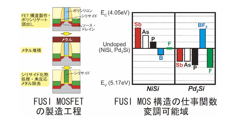 そこで,Mo電極に固相拡散で窒素を導入する方法(2003 年)や,NiSi及びPd2Si フルシリサイドゲート(FUSI)のシリサイド化前のポリシリコンに不純物を添加することで,仕事関数の変調が可能であることを示した(2004~2006 年).