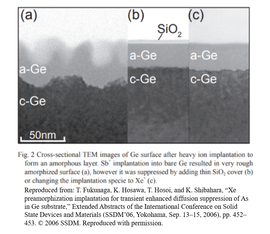 Geの場合,浅接合形成のために重イオン注入によるプレアモルファス化を行うと,Ge表面の揮発性酸化物の反応性脱離によって顕著な表面荒れが生じてしまうが((a) Sb注入),SiO2キャップ層((b))やXeイオンによるプレアモルファス化((c))によってそれが抑制できることを見出した(2006 年).