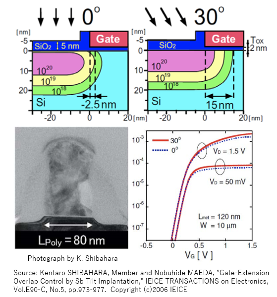 ゲート長 100 nm 以下,ゲート酸化膜 1.2 nm と極微細 MOSFET を実現(1998 年)した上,Sb イオン注入技術を開発した接合深さ 20 nm を達成し(1999 年),さらにソース・ドレインとゲートのオーバーラップ領域を充分に確保するための斜めイオン注入を提案し,電流駆動力の向上を実証した. (2002 年).