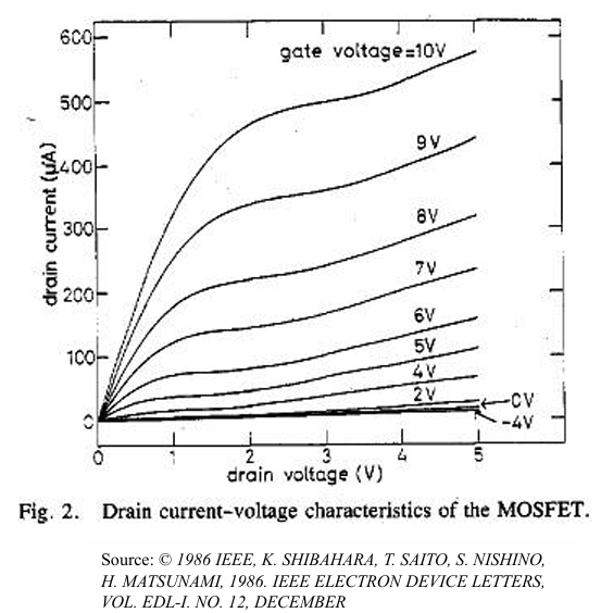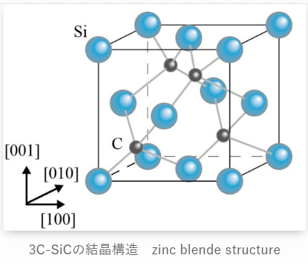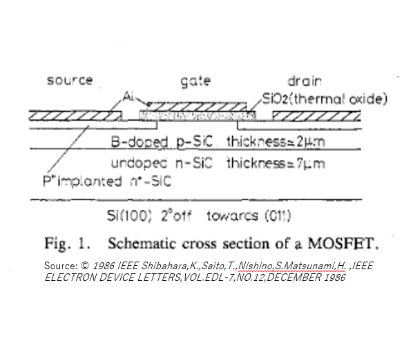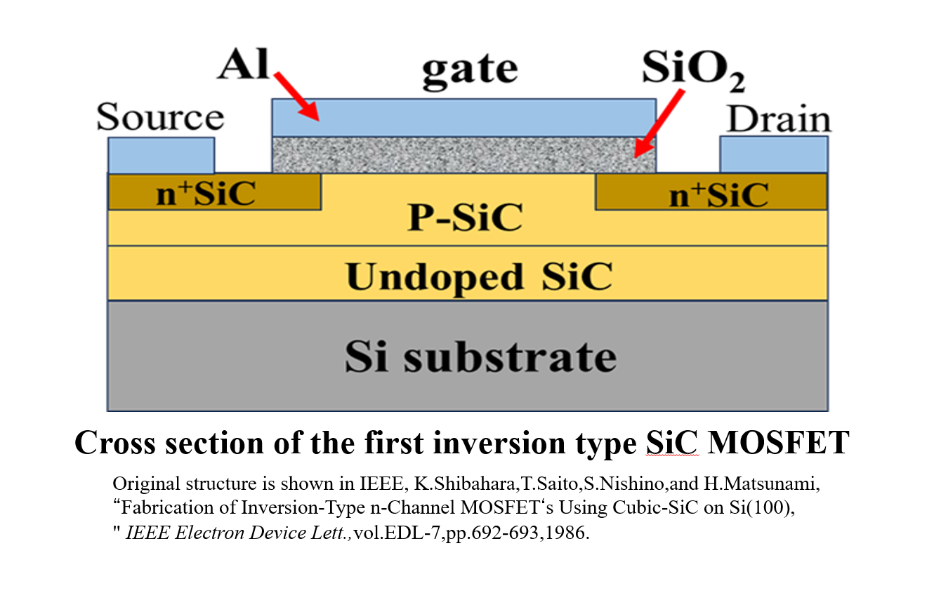 Si(100)基板上に成長した 3C-SiC(100)薄膜結晶を用いて作製した反転型MOSFET(MOS型電界効果トランジスタ)の断面模式図およびドレイン特性.Bドーピングによる低濃度p型SiCの成長,Pイオン注入による低抵抗n型領域(ソーズ、ドレイン)の形成,熱酸化による良質な SiO2/SiC界面の形成など多くの技術を集約してSiC MOSFETが作製された.これは世界初の反転型SiC MOSFETとして当該分野の大きなマイルストーンとなっている(1986年).2001年以降,当該分野では 3C-SiC MOSFETのチャネル移動度が高いことが話題になっているが,1986 年,既に 100cm2/Vsを越えるチャネル移動度を報告している.