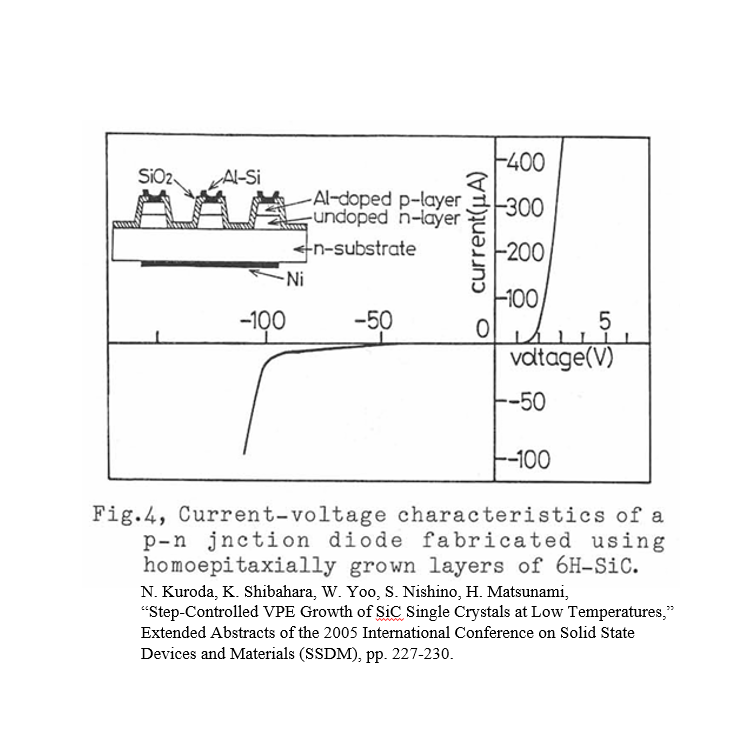 6H-SiC(0001)オフ面上に成長した高品質 6H-SiC 結晶を用いて作製したメサ形 pn ダイオードの断面模式図と電流―電圧特性(1987 年).結晶の品質が高いため,当時としては例外的に優れたデバイス特性を示した.