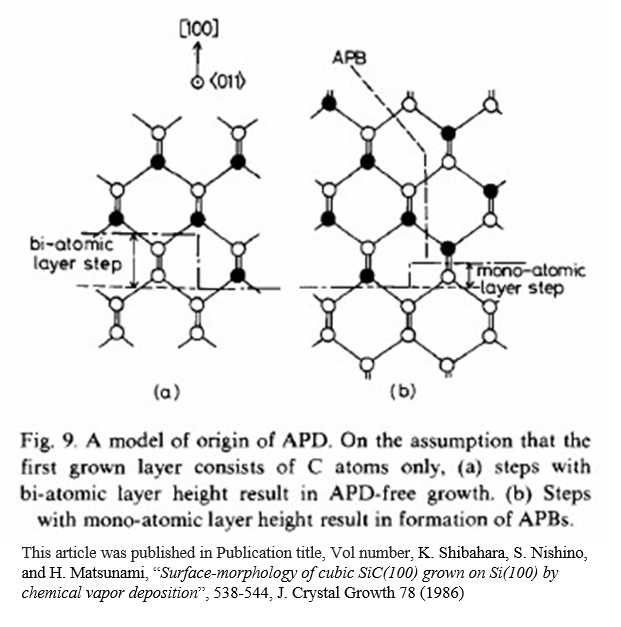 Si(100)基板上に3C-SiC(100)がエピタキシャル成長する際に起こるAPDの生成機構を説明する模式図.Si 基板表面の原子ステップの高さにより,APD(Anti-Phase-Domain)が発生しない場合((a))と発生する場合((b))が存在することを提案した(1986 年).