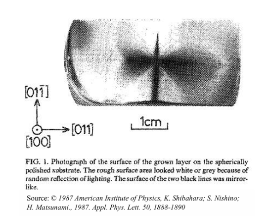 球面研磨を施した Si(100)基板上に 3C-SiC 薄膜結晶を成長させた試料の写真.Si(100)面ジャスト(試料の中央部)上ではSiC表面が荒れるのに対し,(100)面から[011]方向に数度傾けた面上では表面の平坦な SiC 層が得られることを初めて見出した.この現象を,SiC 成長層中における APD(Anti-Phase Domain)発生の有無によることを結晶学的に解明した(1987 年).