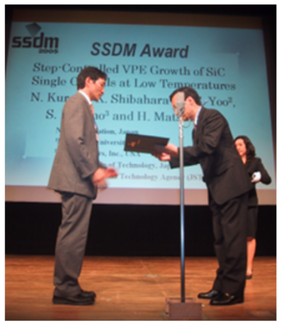 6H-SiC(0001)基板にオフ角を導入することにより、高品質 6H-SiC のホモエピタキシャル成長を初めて実現した「ステップ制御エピタキシー」の国際会議発表論文の題目部(1987 年).今日の SiC パワーデバイス実用化の出発点となった当該分野最大のマイルストーンである.この研究業績に対して SSDM Award が 2005 年に授与された