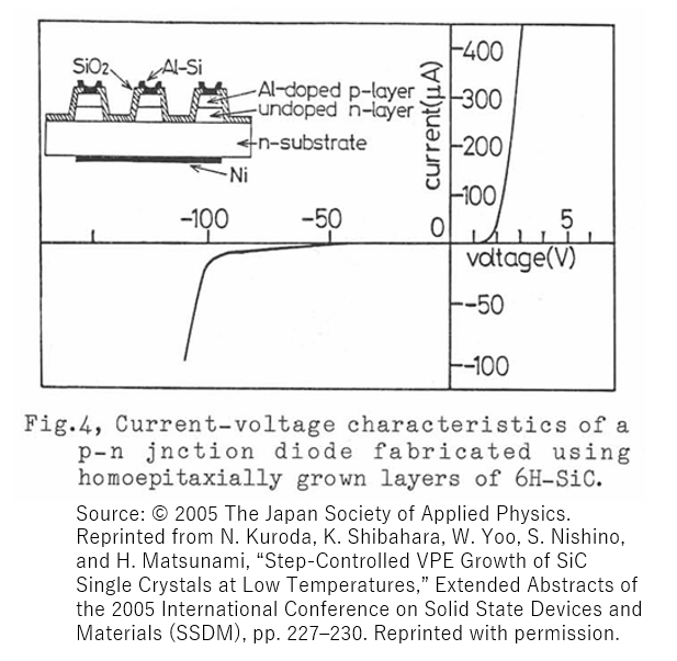 6H-SiC(0001)オフ面上に成長した高品質 6H-SiC 結晶を用いて作製したメサ形 pn ダイオードの断面模式図と電流―電圧特性(1987 年).