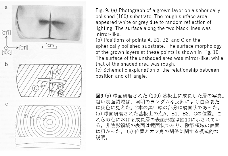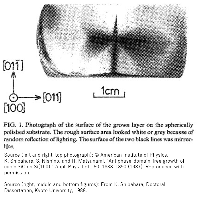 Si(100)面ジャスト(試料の中央部)上ではSiC表面が荒れるのに対し,(100)面から[011]方向に数度傾けた面上では表面の平坦な SiC 層が得られることを初めて見出した.この現象を,SiC 成長層中における APD(Anti-Phase Domain)発生の有無によることを結晶学的に解明した(1987 年).